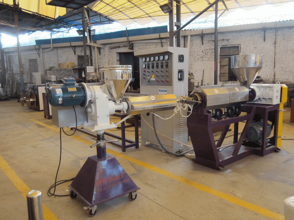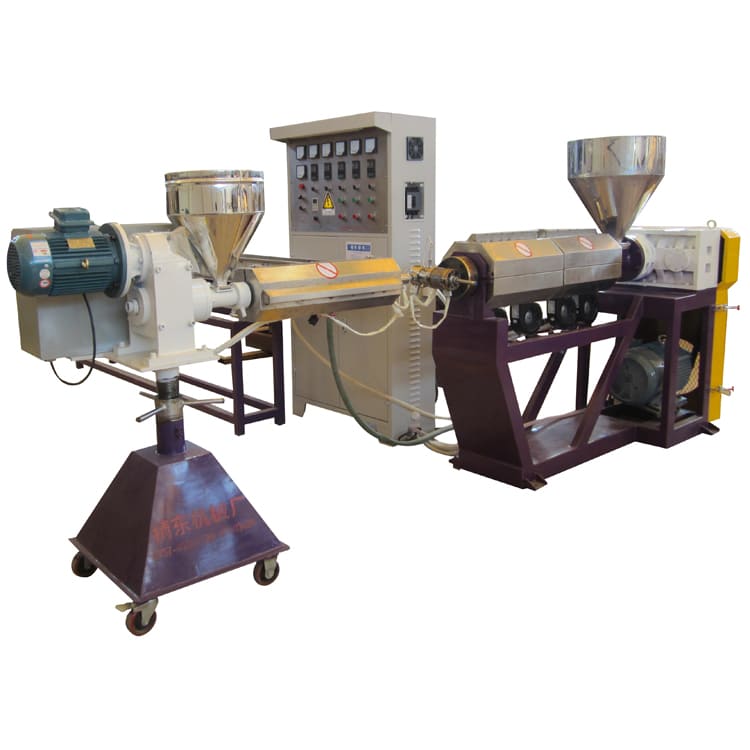 Compose: (2~3) extruders + co-extruding mold → vacuum sizing cooling bath → drawing unit → cutting unit → discharge rack.