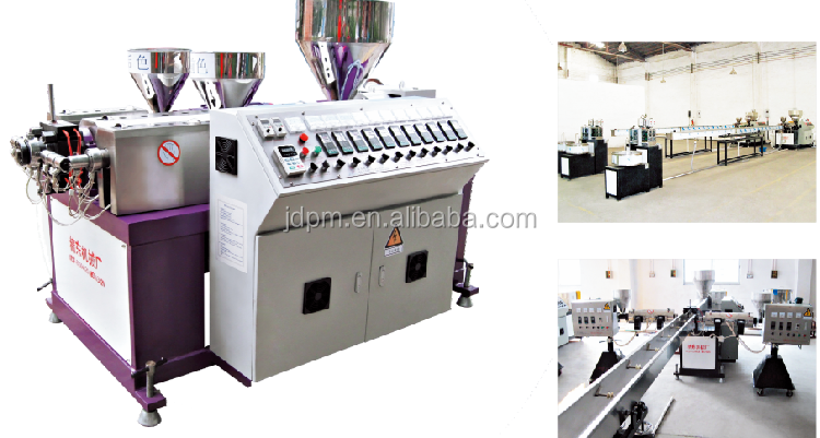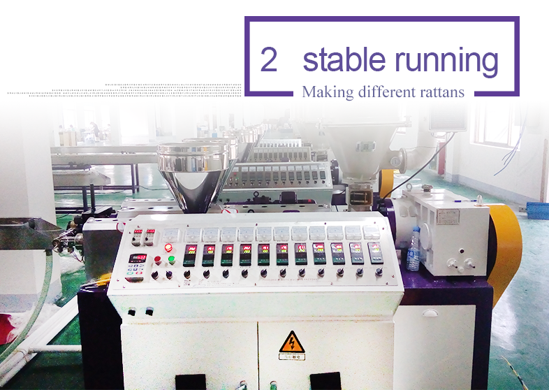 Plastic rattan extrusion line can produce single or multiple color plastic rattan equipped with one or more extruders, and also different shape rattan can be produced if different extrusion moulds are used. Including round rattan, flat rattan, embossing rattan, artificial rattan as well as colorful rattan. Plastic rattan is widely used on rattan chair, tea table ,flower basket ,weaving art and craft, furniture etc .Preferring different raw material such as PE, PP, PVC etc. the extrusion line can produce plastic resembling rattan with differing texture.